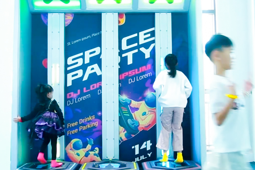 Players step on designated pressure-sensitive zones on the floor to activate preset responses such as music and fun sound effects, dynamic lighting changes (colorful LED flashes and patterns), or interactive effects (virtual animations and visual feedback).
